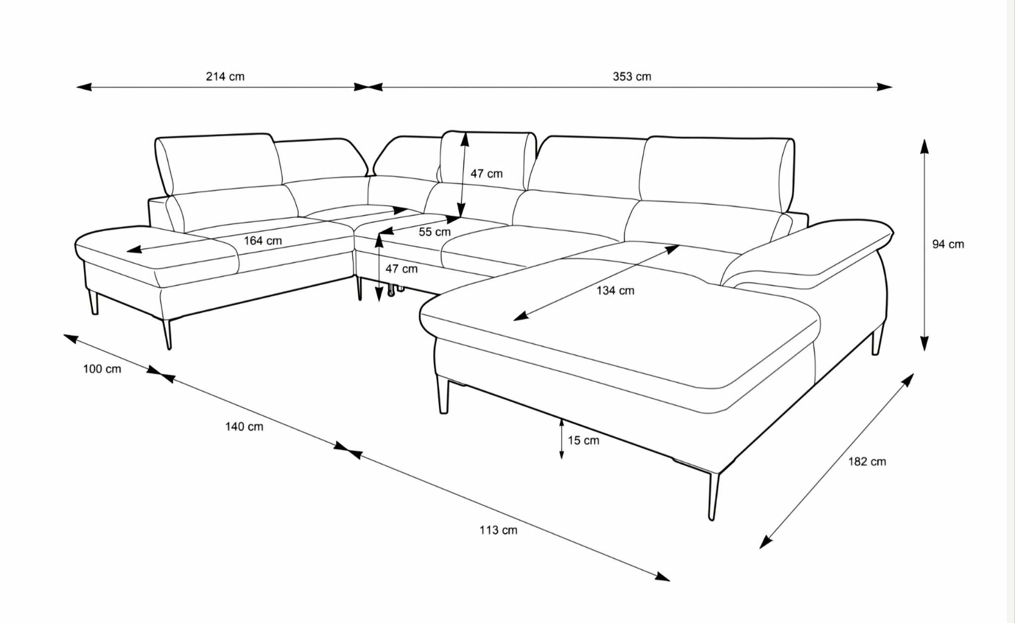 Impressive Dimensions: This amazing sofa measures 353 cm in width and 214/182 cm in depth, making it a spacious and luxurious addition to your living room. The adjustable headrests extend the height to 94 cm, offering ultimate relaxation. And when folded, the height is a sleek 75 cm.